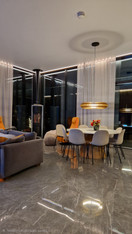 Ikkunalla Riippa, olohuoneissa Pesät. Kohteeseen haluttiin poikkeuksellisen lämpimän sävyiset valonlähteet.